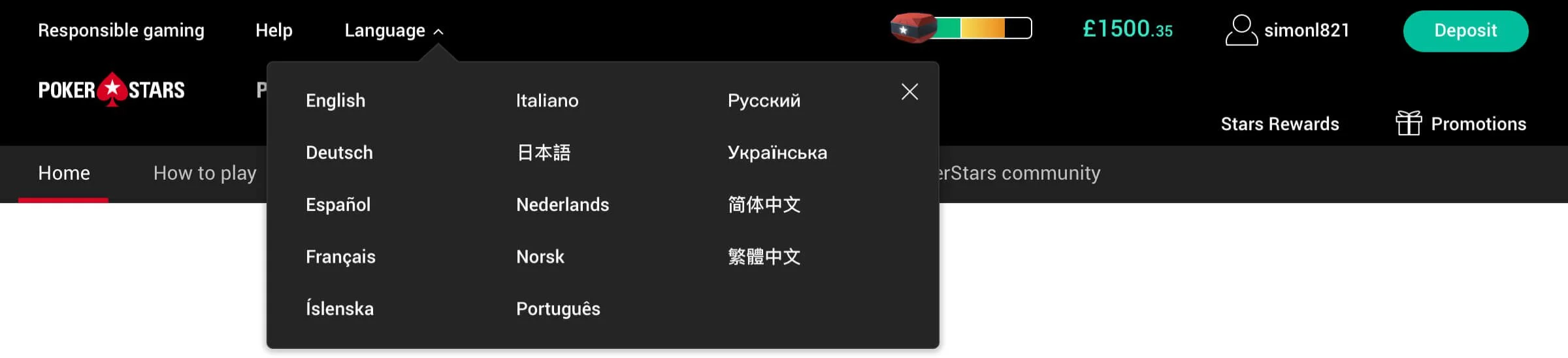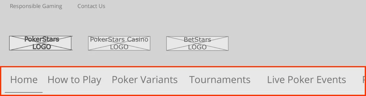 Taking the most prominent position are the 3 product verticals, PokerStars, PokerStars Casino and BetStars. They have equally sized spacing for easy selections, with additional space for more brands to future-proof the design.